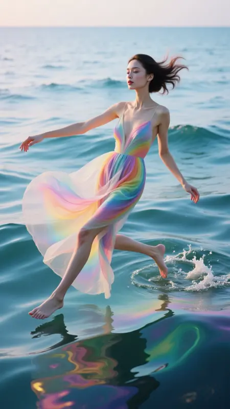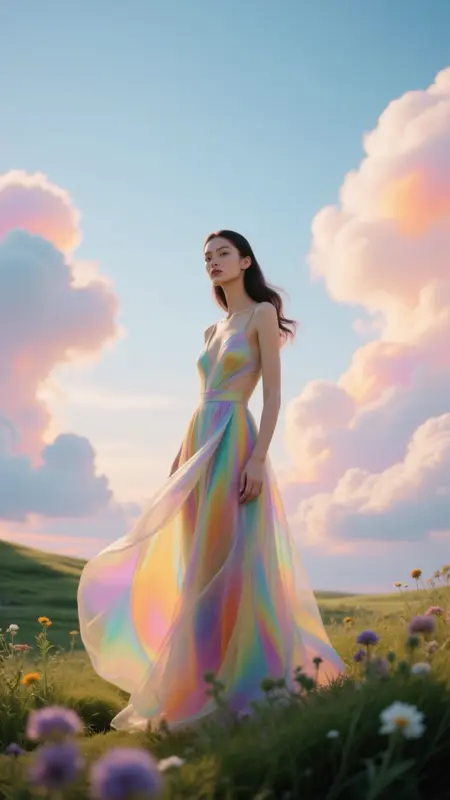 LumenChromatic, masterpiece, best quality, ultra detailed, photorealistic, cinematic lighting, high fashion photography of full body female models, (vibrant colors:1.3), iridescent colors, soft glowing light, evenly lit, well-lit, abstract ambient elements, visionary compositional elements, overall composition, special lighting, dreamlike atmosphere, visual impact, ethereal, top aesthetic, dramatic composition, special angle, tilted frame, unique perspective, full body, beautiful face, artistic pose, foreground