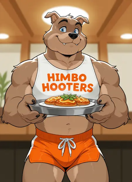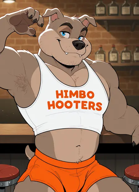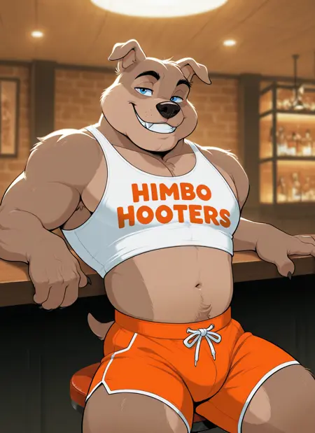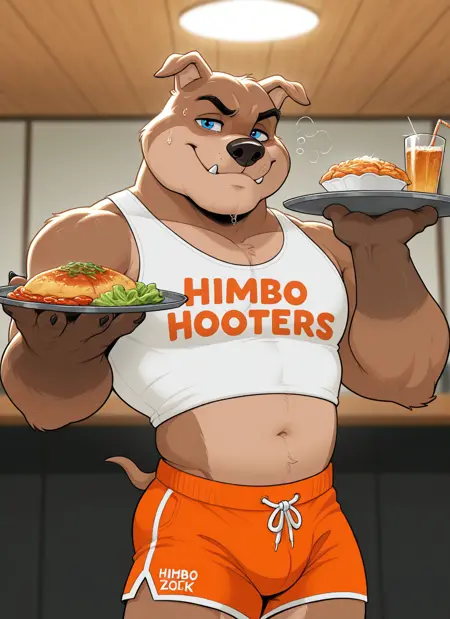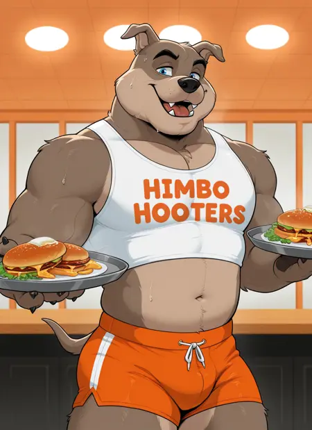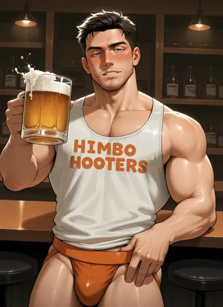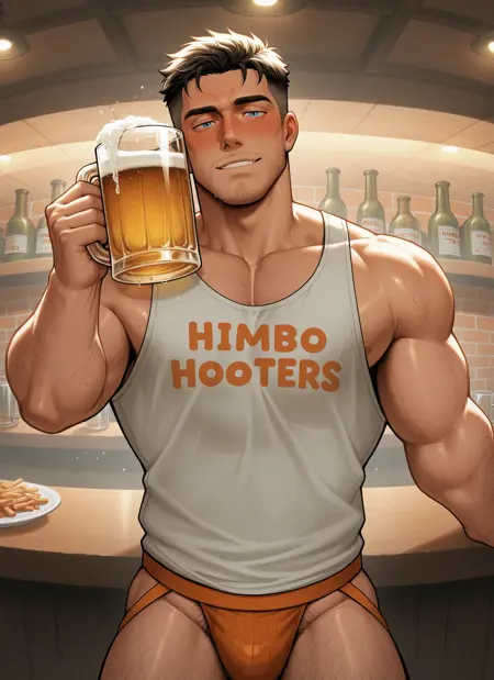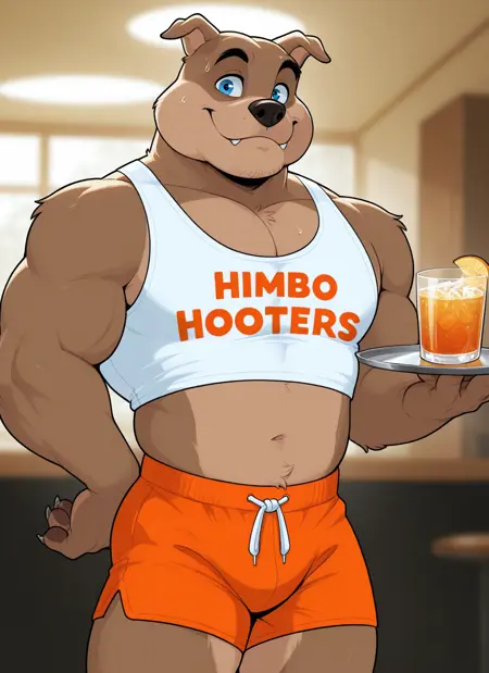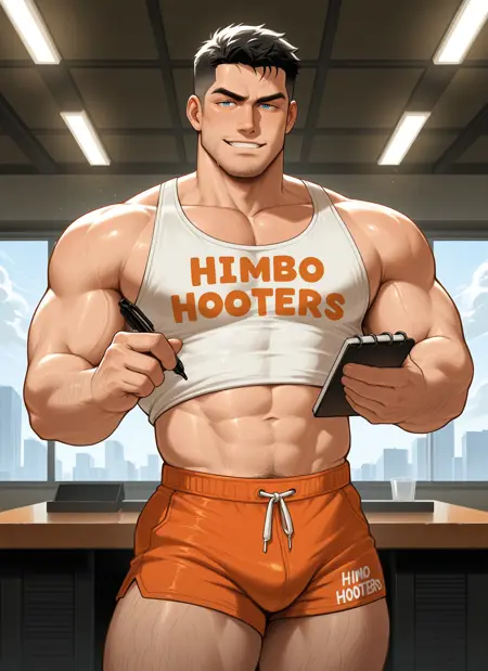 Tags: white crop top, orange shorts, small white himbo hooters text with orange outline on shirt, white crop top with orange outline, white shorts with orange outline, small white himbo hooters text with orange outline on crop top, orange-white jockstrap, orange-white shoes, orange stockings, orange jockstrap