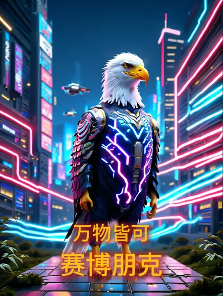 3A metal eagle, with light strips on its body, standing on a metal tree, the tree also has light strips and emits colorful light, cyberpunk, neon lights, 4K, HD, detailed, Cyberpunk