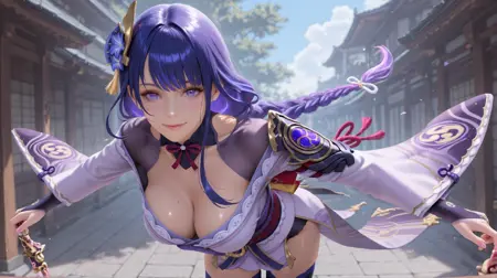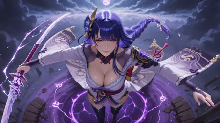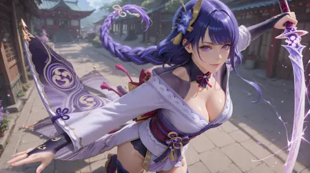 Raiden Shogun,1girl,raiden shogun,solo,japanese clothes,purple eyes,long hair,hair ornament,kimono,thighhighs,purple hair,flower,shoulder armor,purple flower,mole under eye,wide sleeves,mole,obi,armor,obiage,sash,obijime,ribbon,coattails,assel,mitsudomoe \(shape\),tomoe \(symbol\),long sleeves,bridal gauntlets,braid,sandals,geta,okobo,floral print,hair flower,tabi