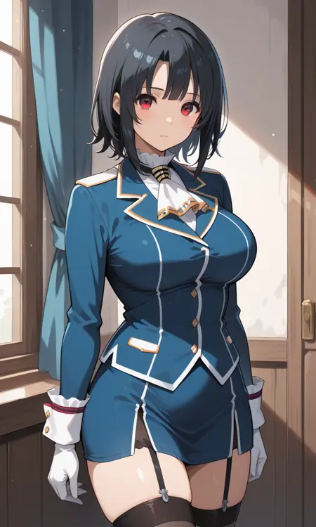 默认装扮: takaoKC, 短发, 黑发, 红眼, 黑色手套, 长袖, 帽子, 外套, 领结, 贝雷帽, 蓝色外套, 蓝色头饰, 蓝色裙子, 吊袜带, 过膝袜