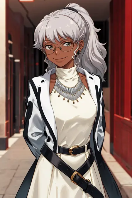 キャラクタートリガー:1girl grey hair ponytail dark skin glasses earrings