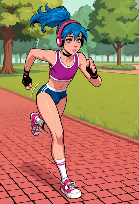 Prompt: fanny price, otoko no ko, solo, blue hair, blue eyes, twintails, makeup, lips, choker, beanie, jewelry, earrings, crop top, bear print, brown bridal gauntlets, fur bracelet, skirt, midriff, hip tattoo, socks, panties, microskirt, sneakers