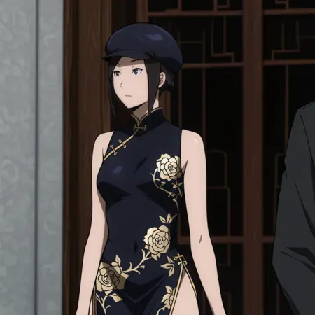 Trigger with chinese dress: ErikaSleevelessDress, 1girl, cabbie hat, china dress, short hair, black hair, sleeveless, chinese clothes, black eyes, cowboy shot
