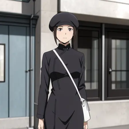Trigger : Erika, 1girl, cabbie hat, brown hair, short hair, brown eyes, black dress, breasts, long sleeves, cowboy shot
