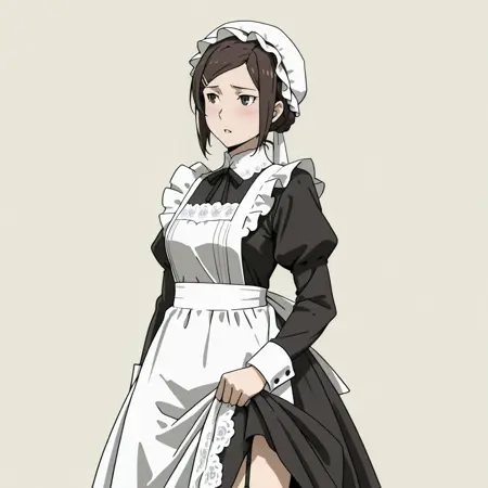 Trigger with hat: ErikaWithoutHat, 1girl, brown hair, hairclip, single hair bun, hair ornament, long sleeves, braid, short hair, black eyes, black dress, cowboy shot
