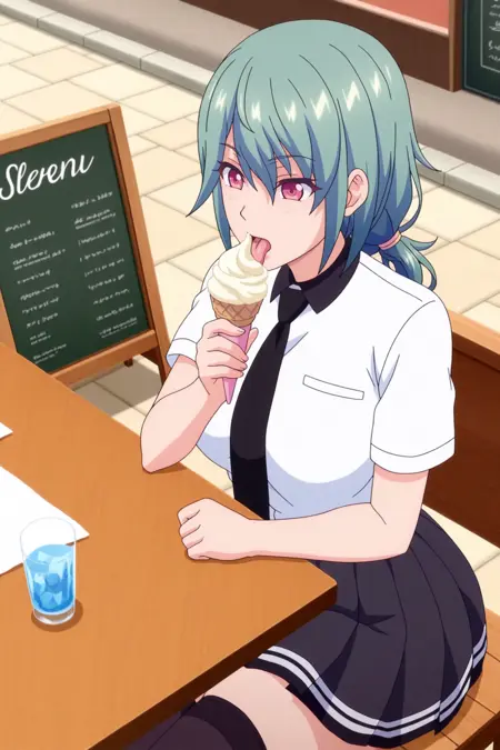 jiyokuema, 1girl, solo, green hair, pink eyes, long hair, low side ponytail