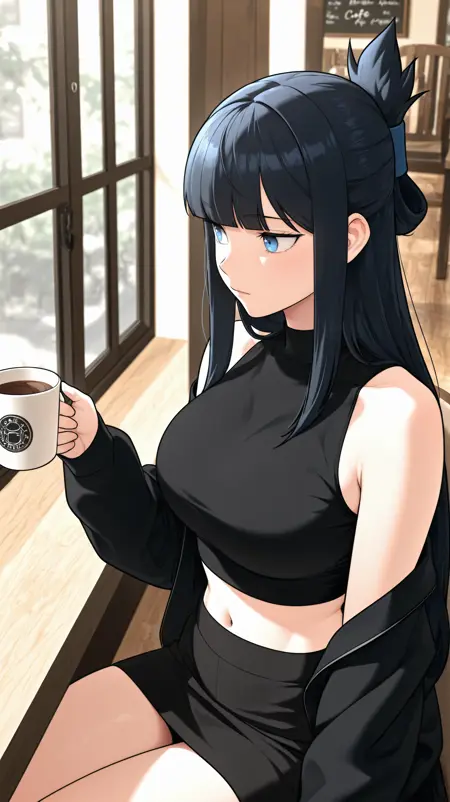 long hair, black hair, blunt bangs, hair up, blue hair accessory, blue eyes, black crop top, white jacket, navel, black pants, sweatpants, jacket off shoulders,