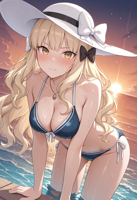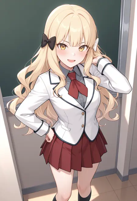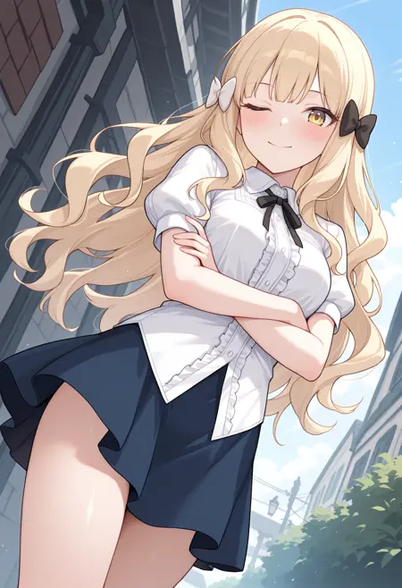 rlpsrn, blonde hair, wavy hair, long hair, yellow eyes, hair bow, black bow, white bow, medium breasts,