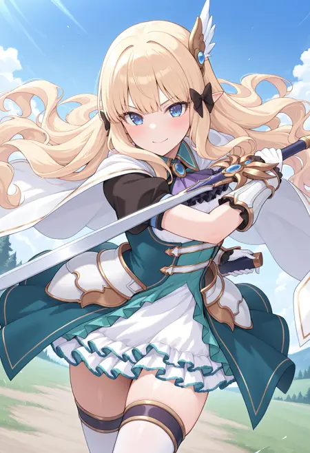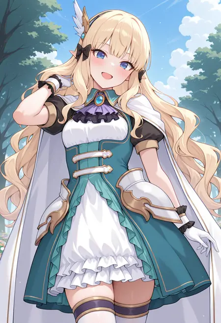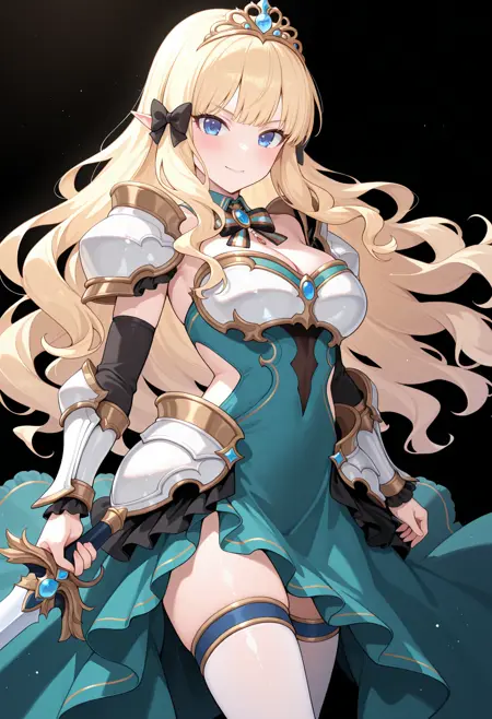 pcrsrn, blonde hair, wavy hair, long hair, elf, pointy ears, blue eyes, medium breasts,