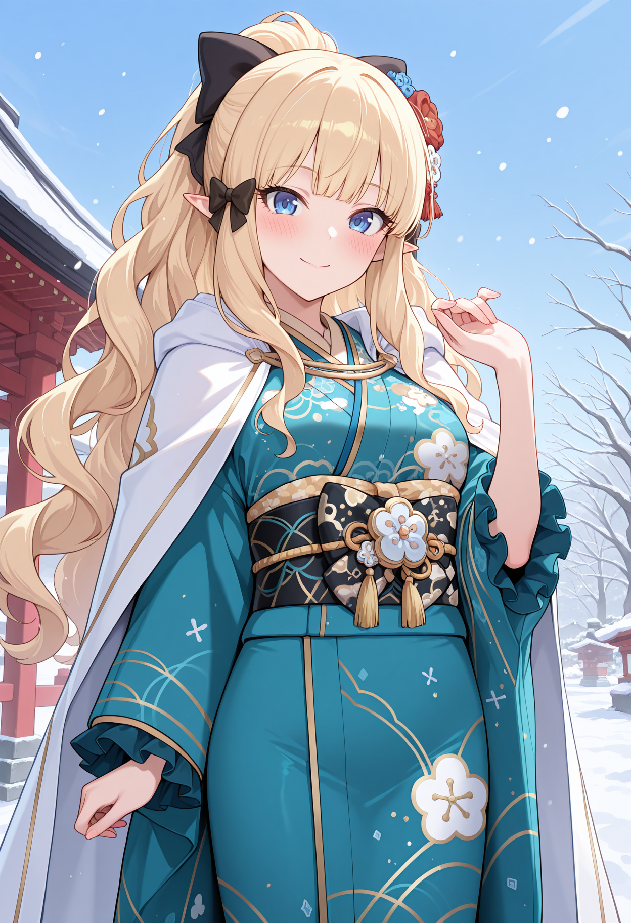 - psrnny, hair bow, hair flower, ponytail, hair up, aqua kimono, print kimono, black sash, black bow, obi, flower ornament, frilled sleeves, white cape,