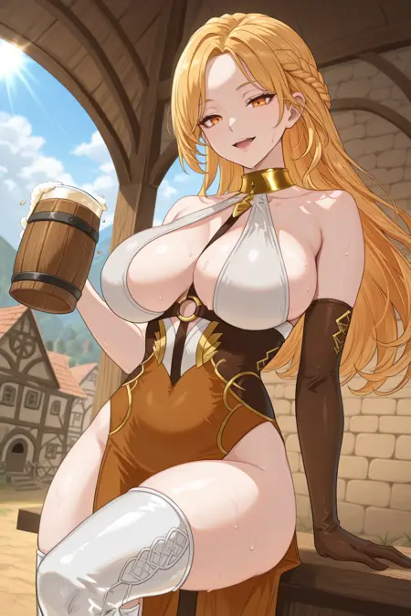Default alt : gold collar, multicolored dress, white dress, orange dress, brown dress, gold dress, sleeveless dress, center opening, strap between breasts, o-ring strap, pelvic curtain, white boots, thigh boots, high heel boots, single elbow glove, brown gloves