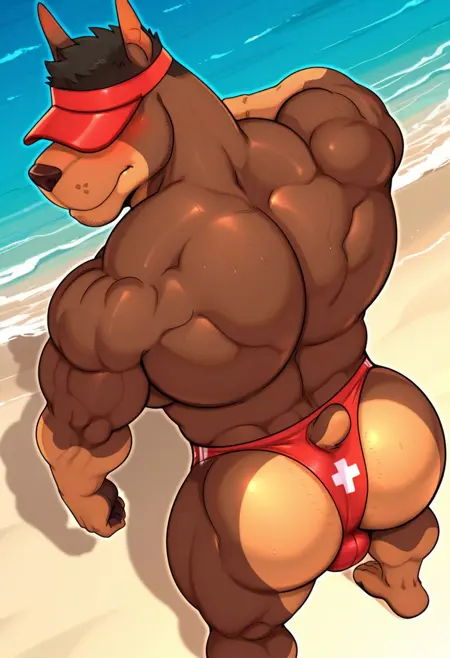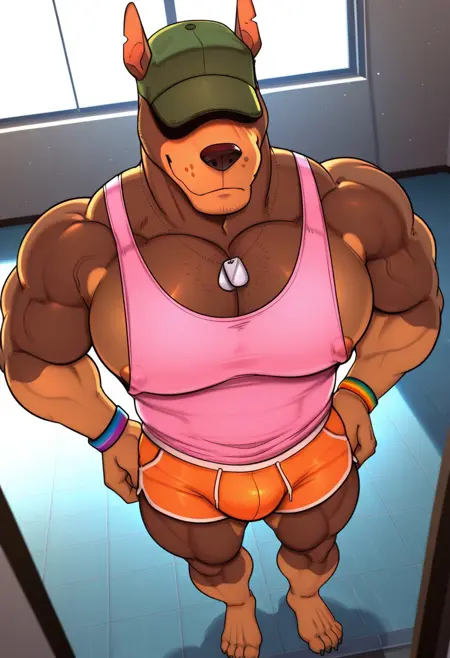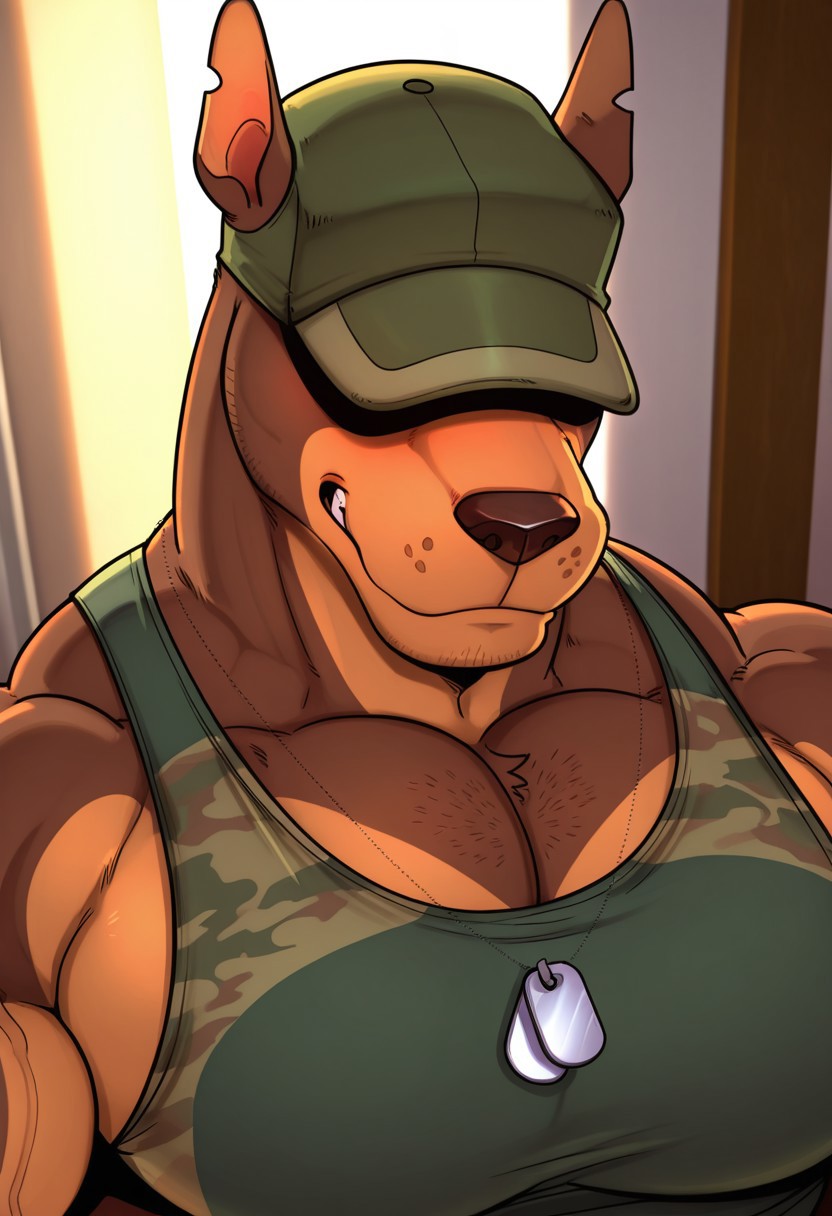 Reinforcement Prompts: "doberman, furry, short tail, black eyes, covered eyes, muscular, bara, mature, large pectorals"