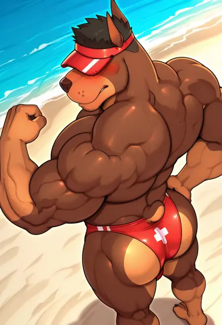 Outfit Prompts: "tank top, dolphin shorts, green cap, red speedo, red visor cap"