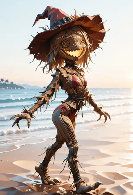 Removing "scarecrow" from the prompt reduces the amount of straw shown on the character.