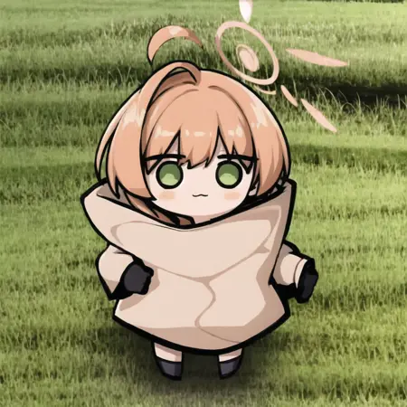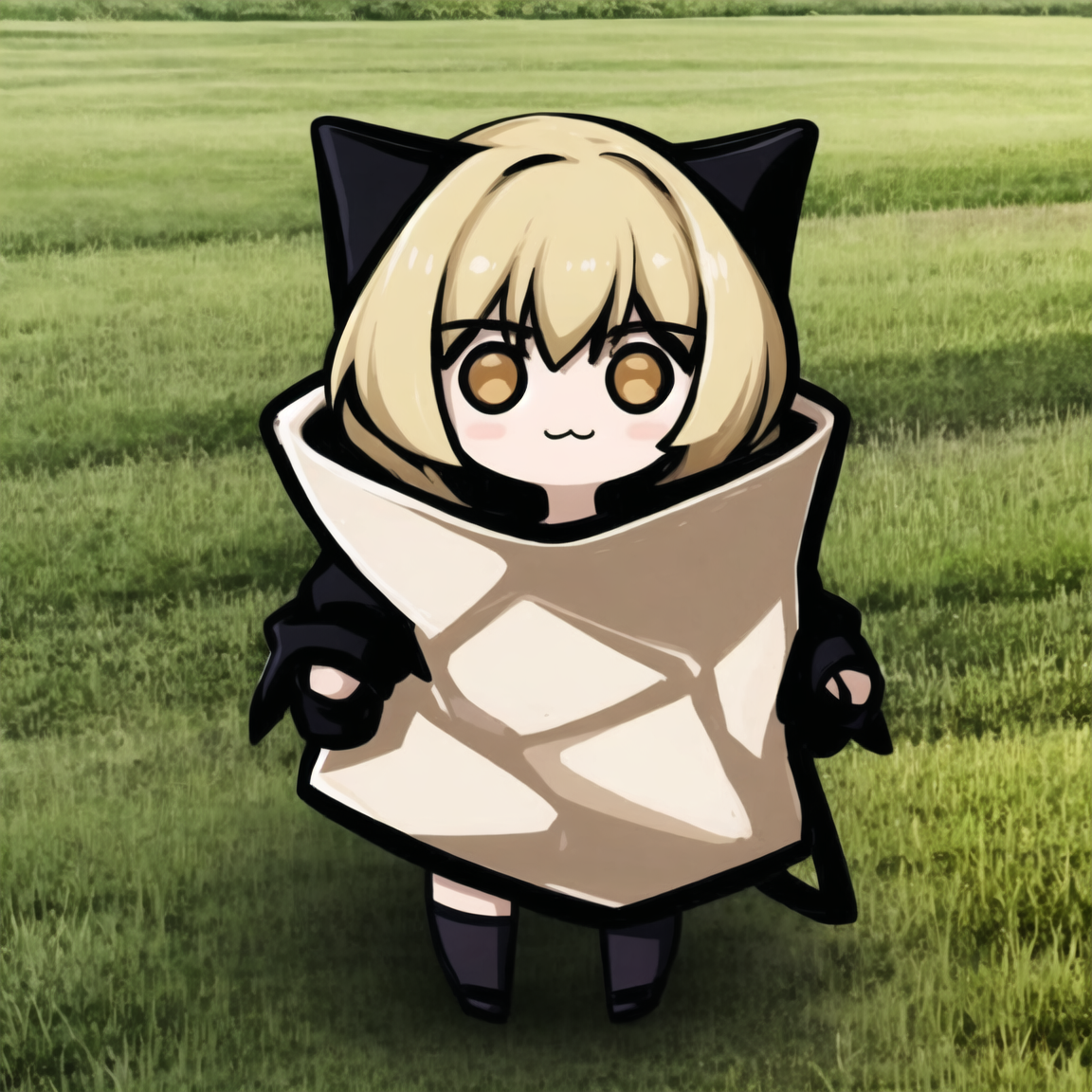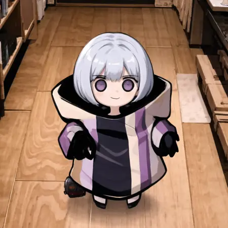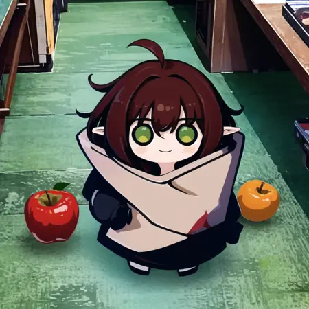 你应该使用提示词描述角色的特征,例如:bagcat,木地板,白发,绿眼,1girl, solo, chibi,