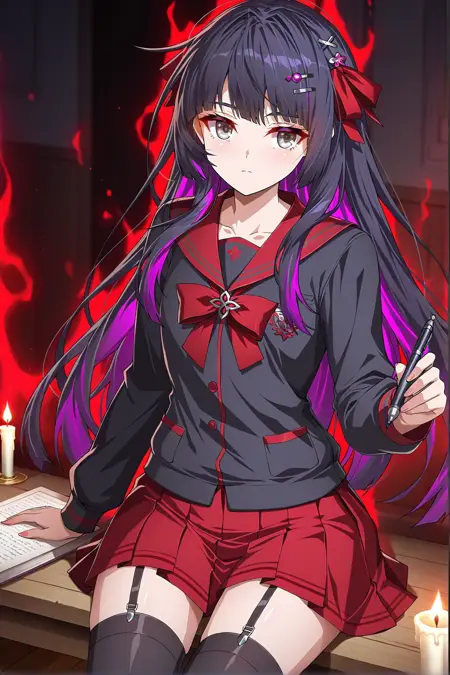 grey eyes, black hair, purple hair, multicolored hair, long hair, hair ribbons, hair ornament, flat chest, serafuku, red bowtie, black shirt, red sailor collar, frill pleated red skirt, black thighhigh, garter belt, black loafers