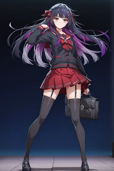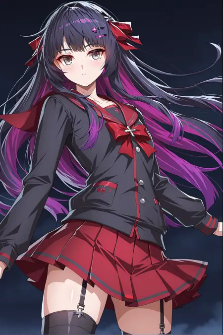 grey eyes, black hair, purple hair, multicolored hair, long hair, hair ribbons, hair ornament, flat chest, serafuku, red bowtie, black shirt, red sailor collar, frill pleated red skirt, black thighhigh, garter belt, black loafers
