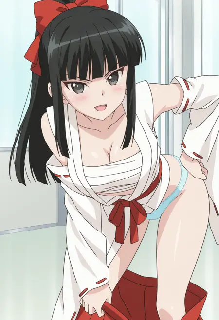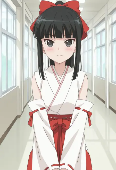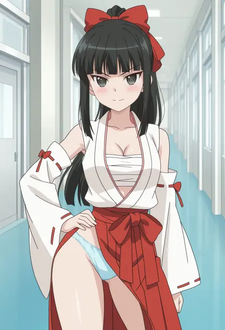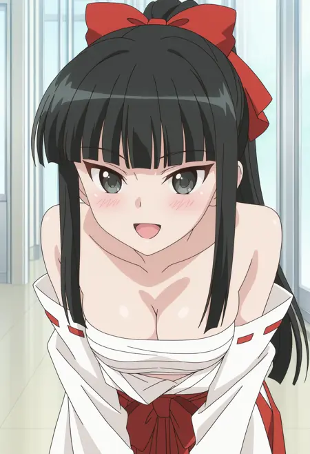 r15kmai, black hair, long hair, black eyes, ponytail, blunt bangs, hair bow, red bow, medium breasts,