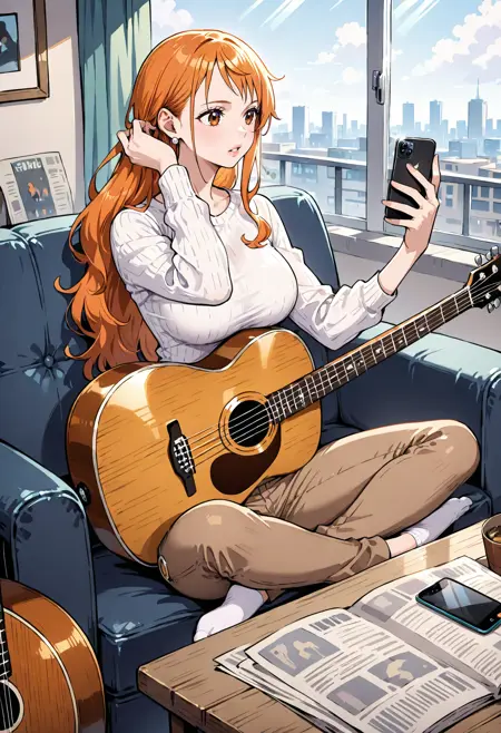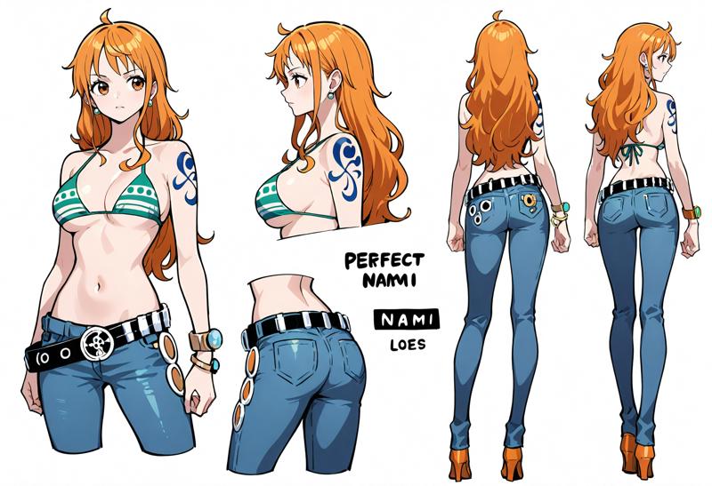 Draft outfit: 1girl, breasts, swimsuit, bikini, tattoo, jewelry, pants, long hair, jeans, denim, bikini top only, orange hair, earrings, belt, blue pants, bracelet, shoulder tattoo, large breasts, brown eyes, collarbone, striped bikini, striped, bangs, bare shoulders, green bikini, underboob, medium breasts, arm tattoo, bangle, orange eyes, ahoge, sidelocks, black belt