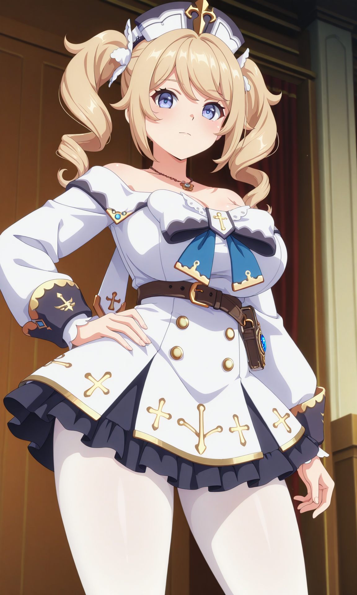 1girl, blue eyes, blond hair, twintails, white minidress, white high waist pantyhose, Barbara