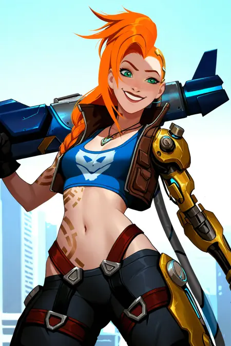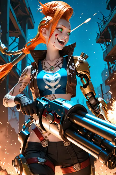 触发词:OdyJnx,长发,橙色头发,莫霍克发型,单侧剪裁,单侧头发向后梳,发饰,机械头,双辫子,机械辫子,不对称辫子,金色胸部纹身,金色手臂纹身,金色腹部纹身,绿色眼睛,高领,棕色背心,短款背心,印花背心,项链,单侧机械臂,单侧裸露手臂,义肢臂,赛博朋克,露腹,单只手套,背带腰带,护腹甲,裤子,腿甲,大腿绑带,单侧护膝,靴子