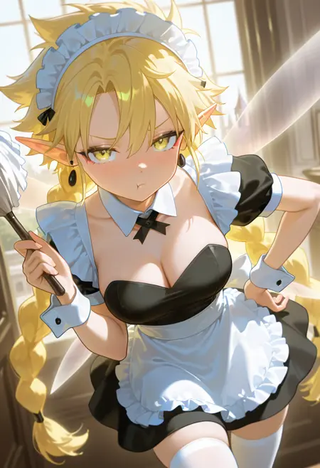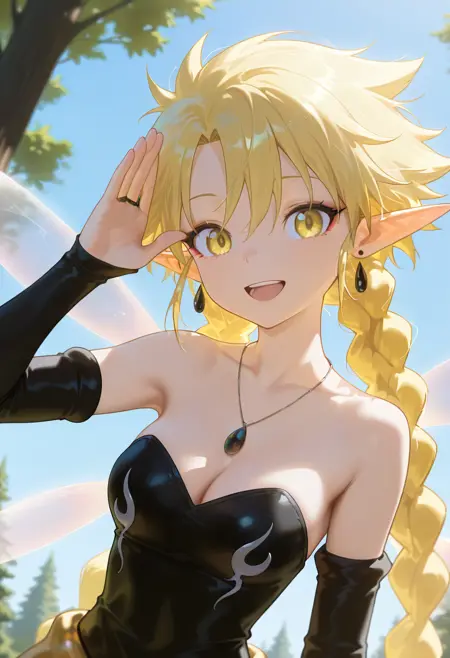 Tags for her look: 1girl, solo, long hair, blonde hair, hair between eyes, very long hair, medium breasts, collarbone, yellow eyes, pointy ears, twin braids, single braid, fairy wings, fairy, transparent wings, eyeshadow, eyeliner,