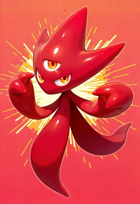 CrimsonWisp, sleek vibrant red body, smooth texture, pointed triangular head, three expressive glowing orange eyes, tendril-like extensions