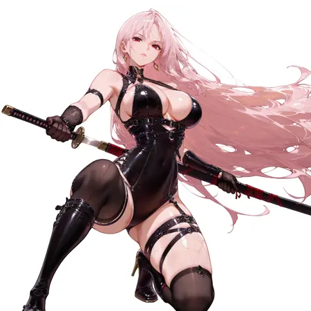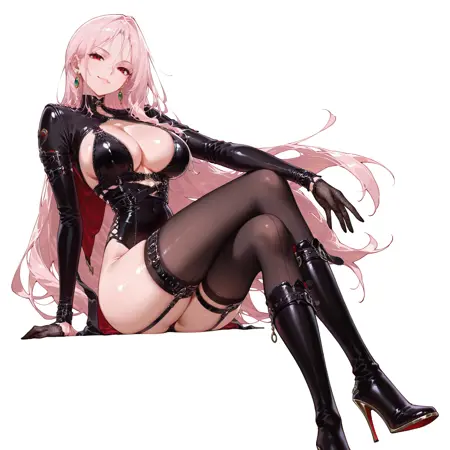 renying,1girl,pink hair,long hair,red eyes,sunglasses,earrings,breasts,cleavage,leather,bondage outfit,black leotard,lace gloves,gloves,long coat,black thighhighs,thigh strap,asymmetrical footwear,high heel boots,