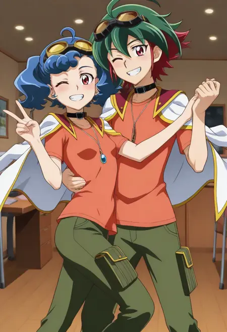 The boy Himself, the Zarc avatar: 1boy, Yuya Sakaki, multicoloured hair, green hair, red hair, green ahoge, red eyes, red eyes boy,