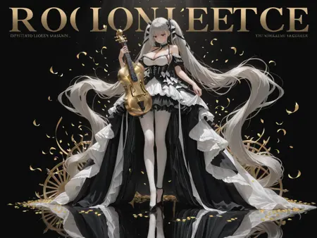 **オプショナル衣装 衣装2:**diertao,absurdly long hair,bare legs,black choker,black footwear,black sailor collar,bow,breasts,clothing cutout,dress bow,dress flower,hair ornament,high heels,large breasts,navel cutout,ribbon,twintails,two-tone dress,two-tone ribbon,veil,white dress,white rose,sleeveless dress,