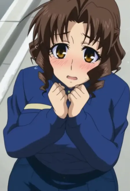 Character: brown hair, brown eyes, short hair, drill hair, large breasts,curvy,