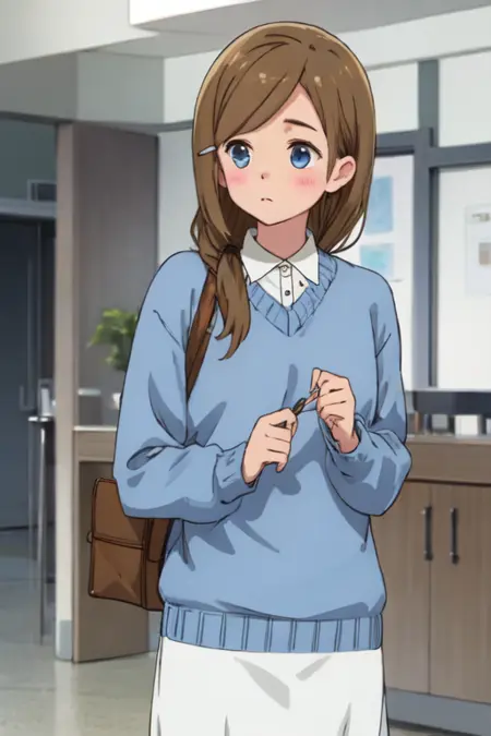 oshie_teruyo,长发,腮红,蓝眼睛,棕色头发,头发垂在肩膀上