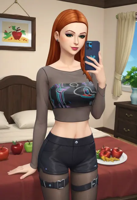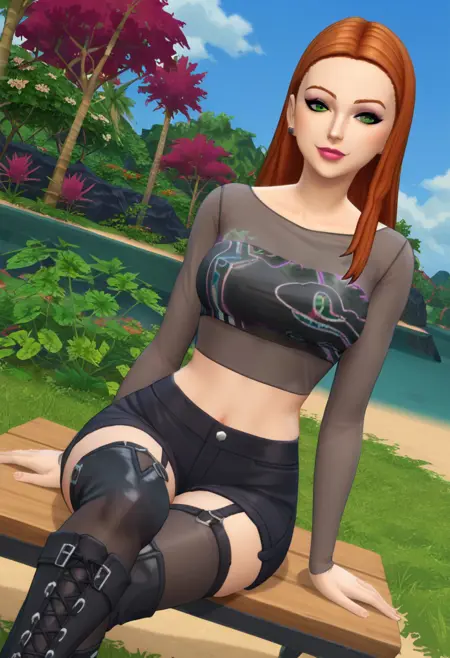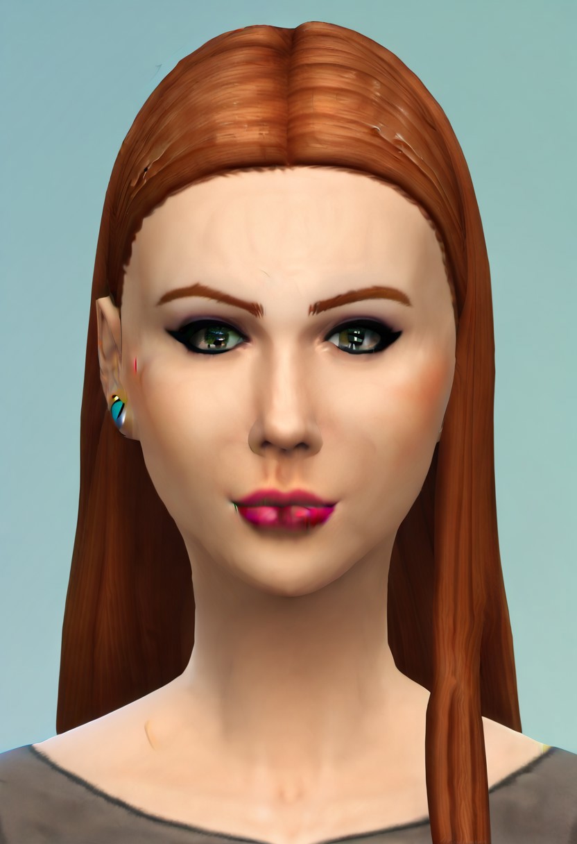 Sims4MorganFyres, 1girl, long hair, brown hair, orange hair, red hair, green eyes, makeup, lipstick, blush, eyeshadow, earrings