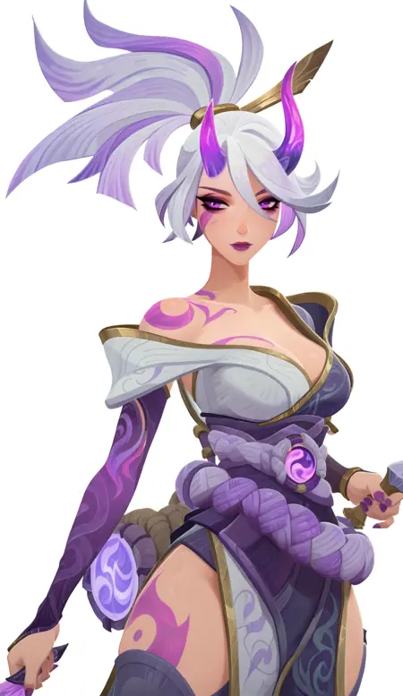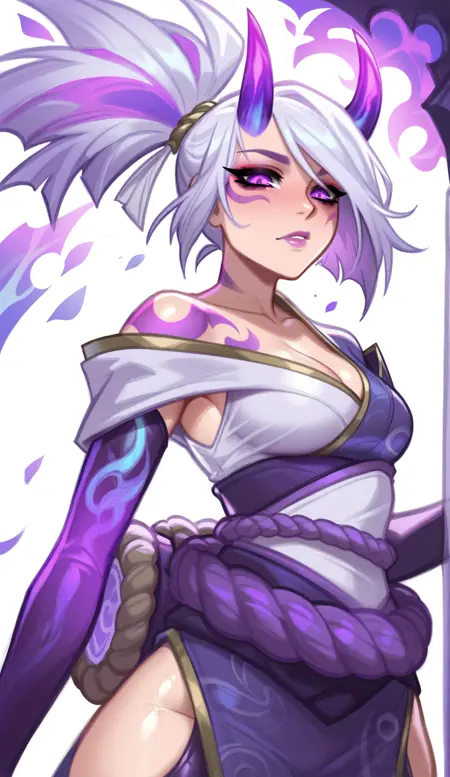 SB_Akali, white hair, long ponytail, side swept bangs, purple eyes, curved purple horns, oni mask, glowing purple tattoos, sleeveless kimono, tight pants, rope belt, detached purple sleeves, open shoulder, stockings, sandals,
