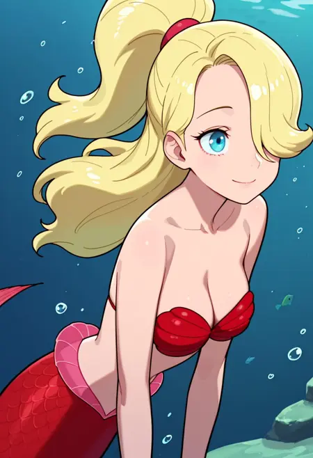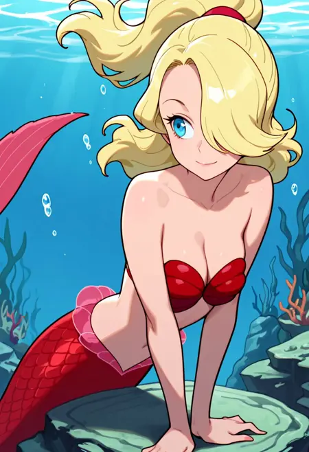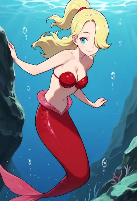 Appearance: blonde hair, blue eyes, long hair, ponytail, hair over one eye, medium breasts, monster girl, mermaid, red tail, scales