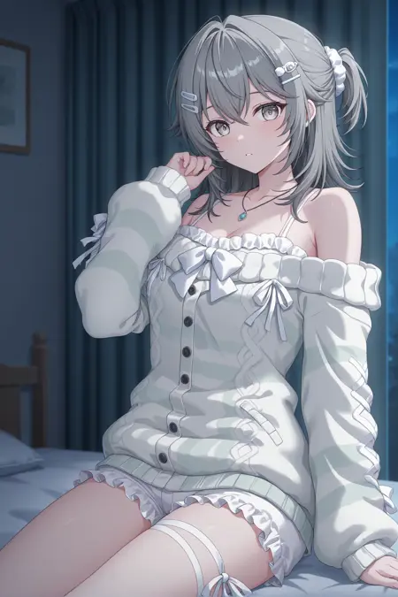 ganymedetcd, grey eyes, grey hair, medium hair, hair clips, hair scrunchie on back, necklace, bare shoulders, stripped mint-white sweater, long sleeves, white frill shorts, single leg ribbons, animal slippers