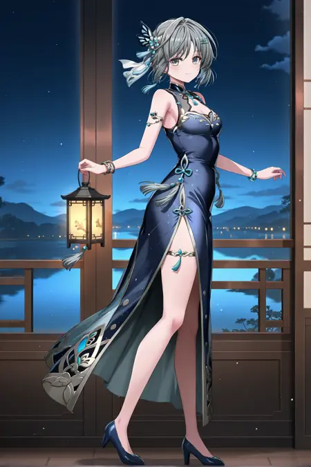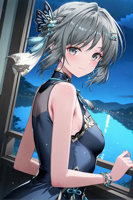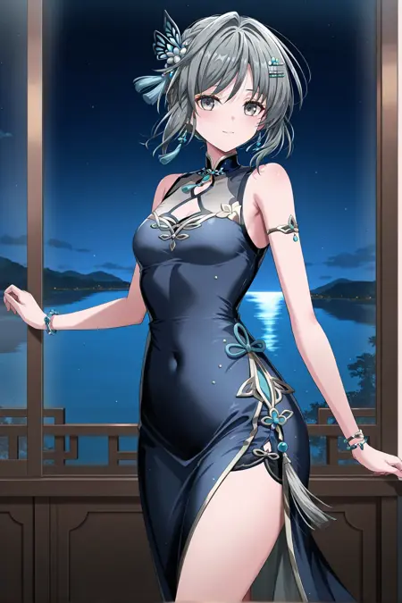 grey eyes, grey hair, short hair, hair ornament, small breasts, sleeveless, dark blue long dress, tassel, bracelet, jewelry, thigh, high heels