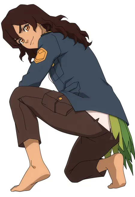 경찰 복장, 어깨장식, 파란색 재킷, 열린 재킷, 흰색 셔츠, 경찰 배지, 잎 스커트, 갈색 바지, 파란색 신발,