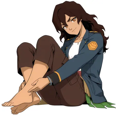 police uniform, epaulettes, blue jacket, open jacket, white shirt, police badge, leaf skirt, brown pants, blue shoes,