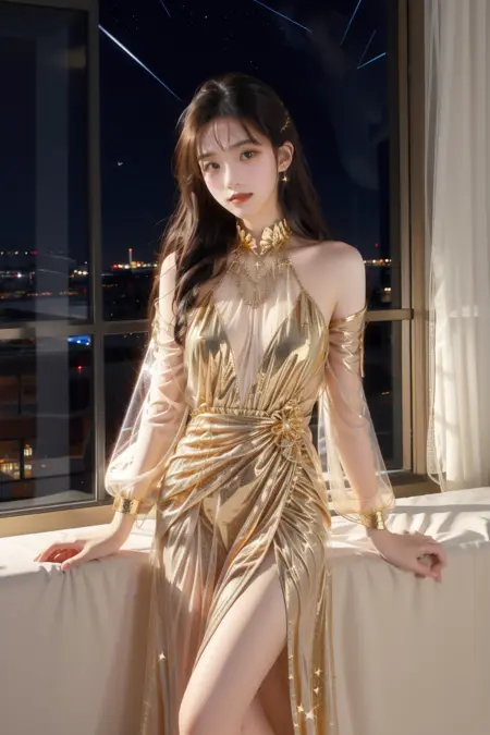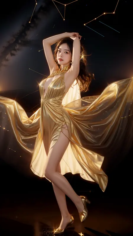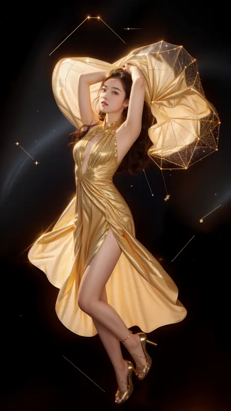 영감 출처: 완전히 튀는 아이디어에서 비롯되었습니다. 이전의 별무리 드레스는 대부분 스팽글, 다이아몬드, 또는 발광 LED로 표현되었지만, 저는 별자리 마법을 통해 별들이 외롭지 않고 서로 연결되어 별자리를 이루길 원했습니다. 금색의 벨벳 질감과 결합되어 고급스러운 느낌을 줍니다.