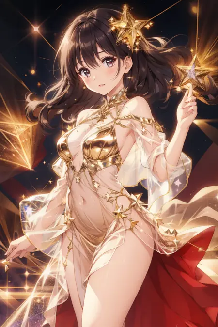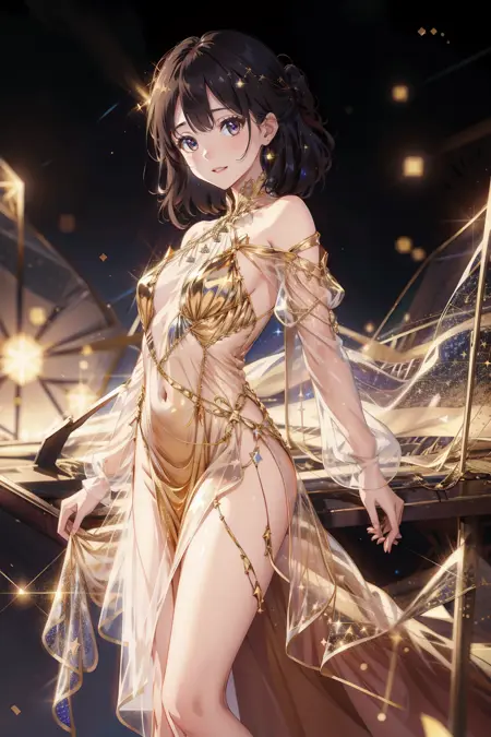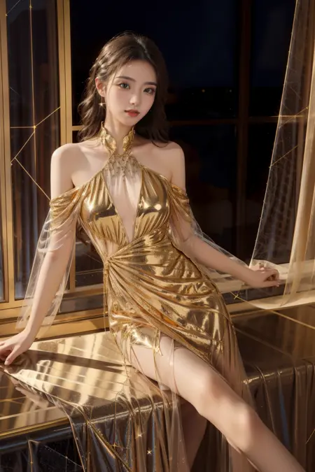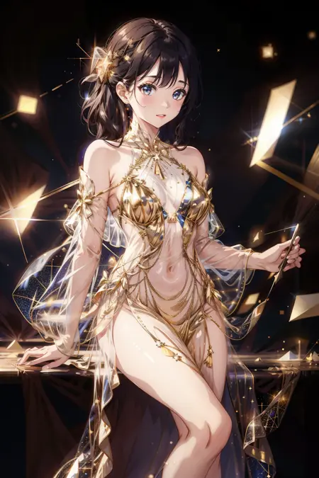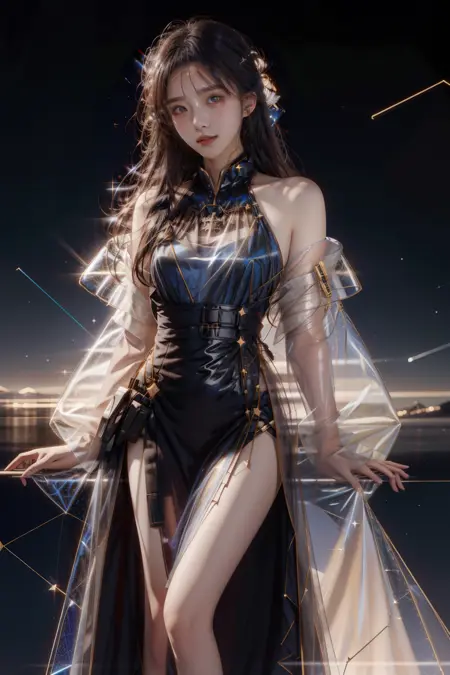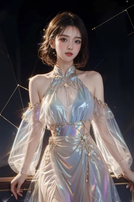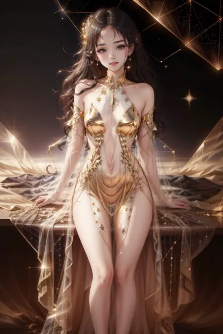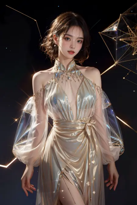이 효과를 드레스 원단 위에 구현하는 것은 매우 어려웠습니다. 저는 별자리 개념의 재질을 기반으로 사전 LORA를 학습시킨 후, 이 사전 LORA를 사용해 이미지를 생성하고 원단과 결합해 보았습니다. 층별로 반복적으로 시도하고 프롬프트를 조정한 끝에, 드레스 헤마에 일부 별자리 재질이 나타나도록 성공했고, 이 중 만족스러운 결과를 선정해 배경을 PS로 제거한 후, 다시 학습하여 과적합된 LORA를 생성했습니다. 그 후 층별로 과적합을 제거해 최종 LORA를 완성했습니다.