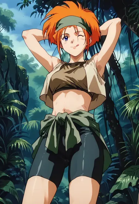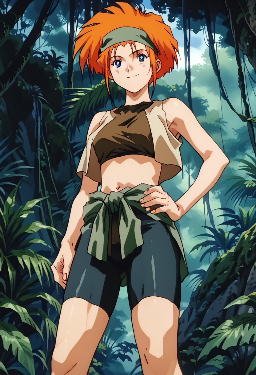 KikiRo, 1girl, orange hair, retro artstyle, midriff, bike shorts, 1990s \(style\), headband, crop top, blue eyes, navel, jacket, sports bra, open clothes, shoes
