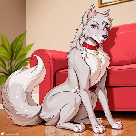 dog, rough collie, grey and white fur, fluffy fur, pink eyes, fluffy dog tail, black nose, red collar, gold dog tag,