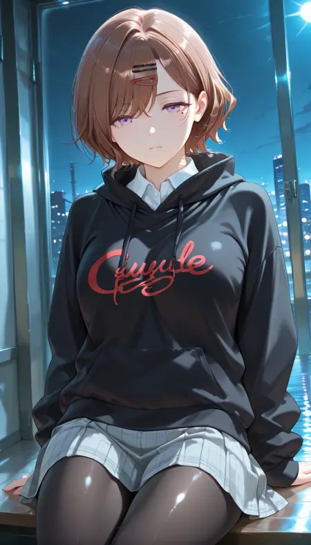 IMHiguMado, breasts, short hair, brown hair, hair ornament, purple eyes, hairclip, mole, mole under eye, swept bangs, hair between eyes,