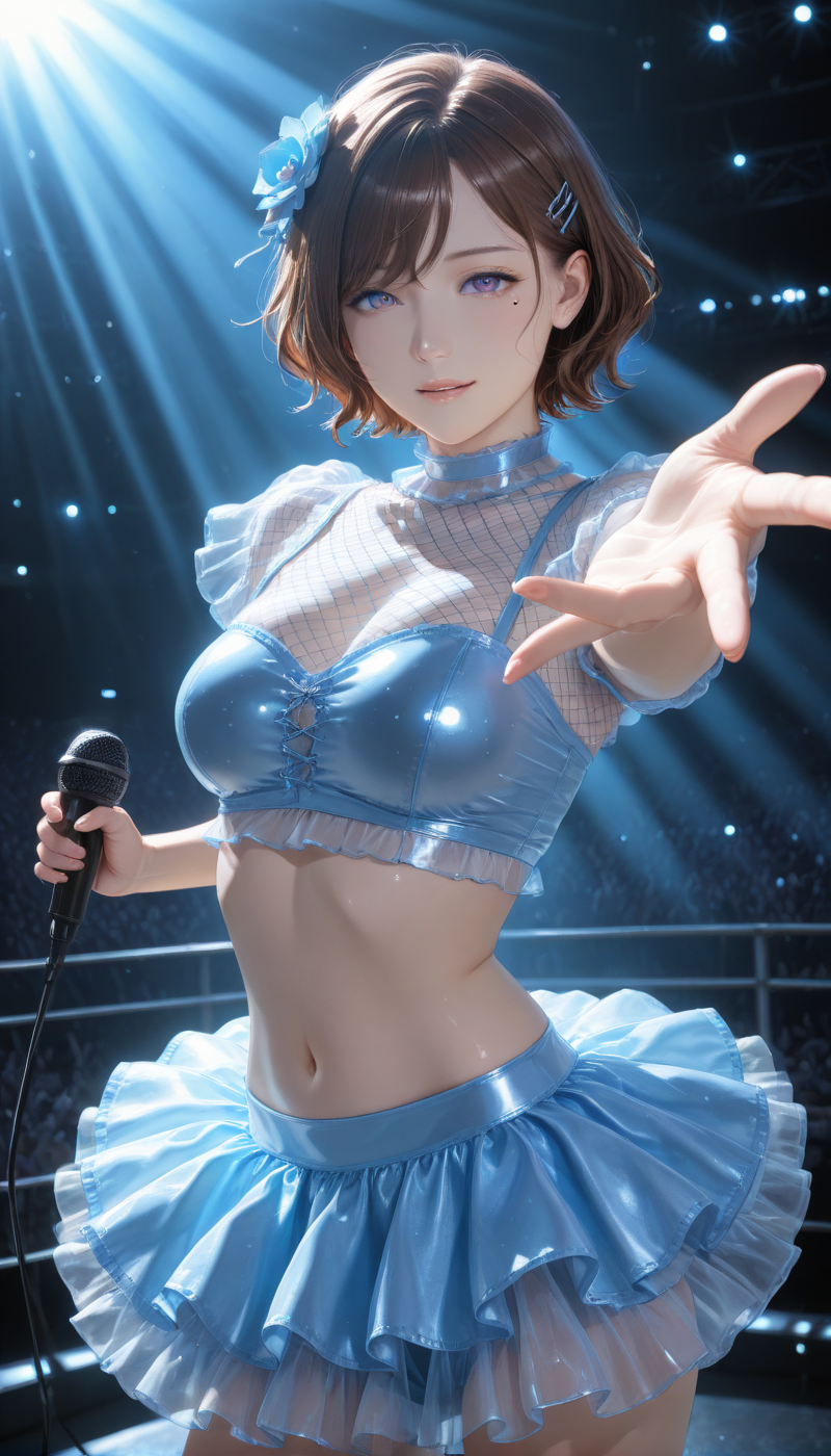 skirt, navel, flower, pleated skirt, frills, choker, midriff, hair flower, miniskirt, stomach, mole, crop top, see-through, frilled skirt, fishnets, blue flower, layered skirt, idol, blue bra, blue choker, fishnet top,