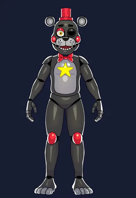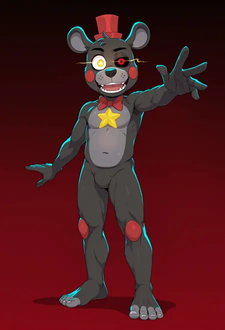 animatronics, two tone skin, metal skin, joint, black skin, left yellow glowing eye, empty right eye, visible teeth, red tophat, red bowtie, yellow star on chest, grey stomach, grey muzzle, black nose, red cheek, grey inner ears, red knee, grey toes