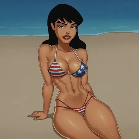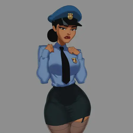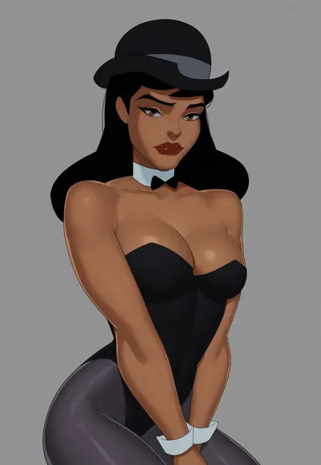 lipstick, black hair, long hair, brown eyes, dark skin, black leotard, hat, white collar, bowtie, cleavage, pantyhose, MontoyaSU, cartoon_screencap