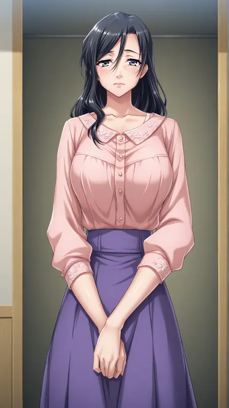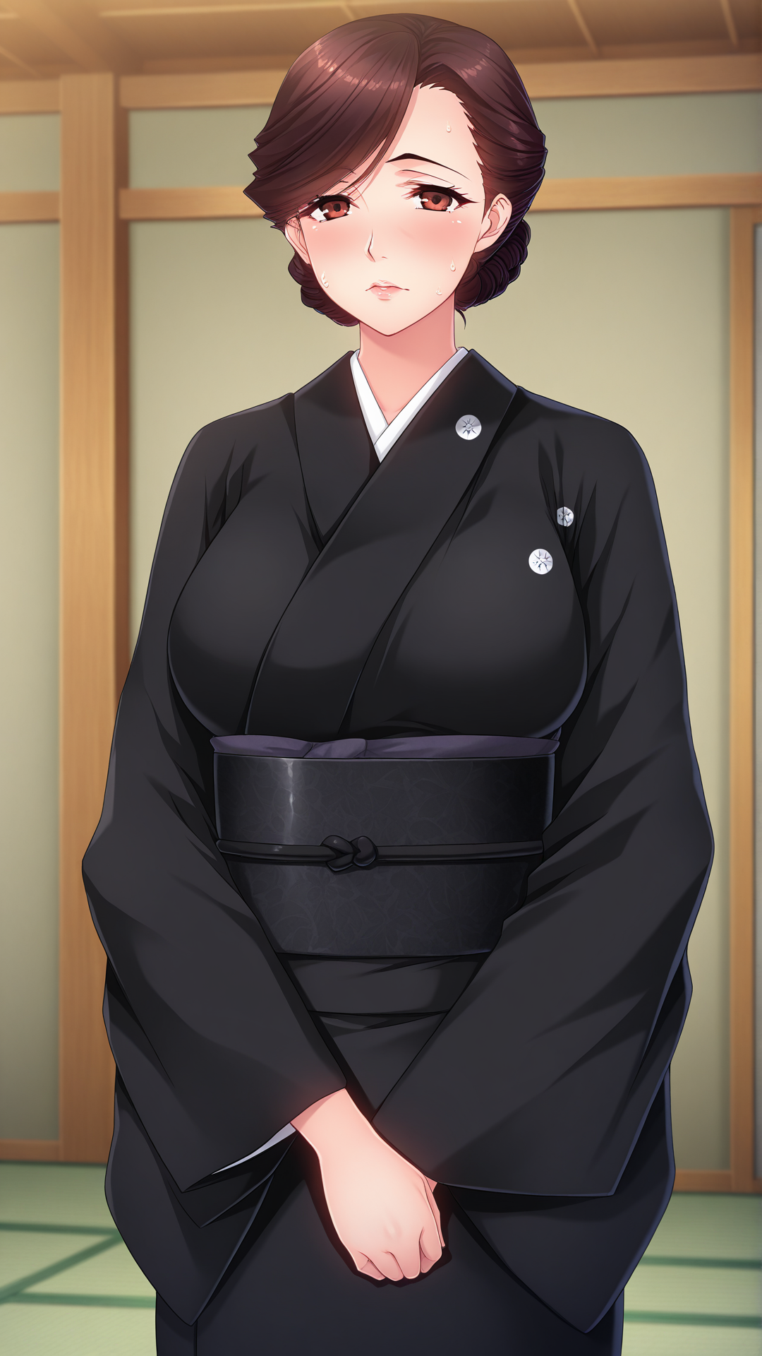 - Minako: minako, wrinkles, gilf, brown hair, long hair(alt:hairbun), brown eyes, white blouse, white skirt(alt: black kimono, mourning clothes)