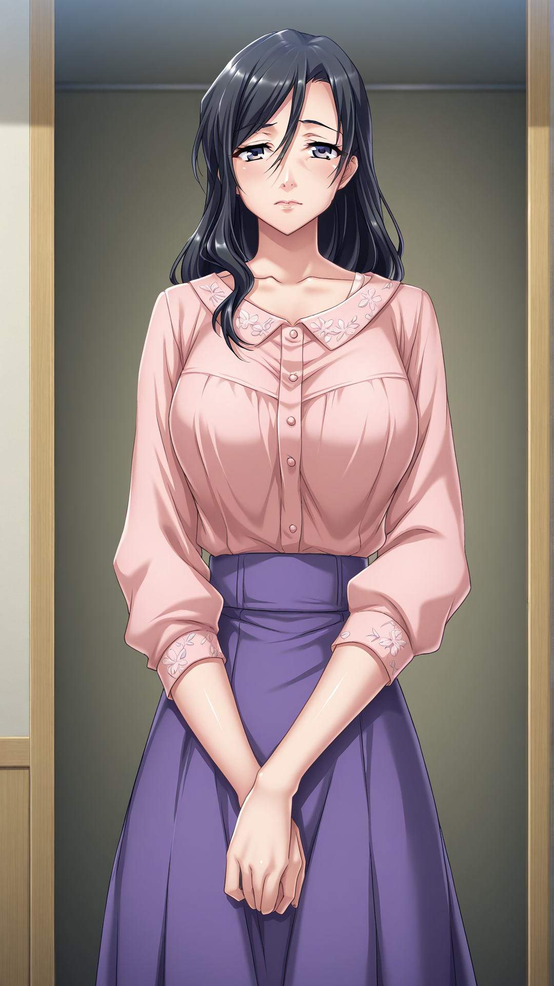 - rumiko: rumiko, wrinkles, gilf, black hair, long hair(alt:hairbun), black eyes, pink blouse, purple skirt(alt: white pajamas, green kimono)